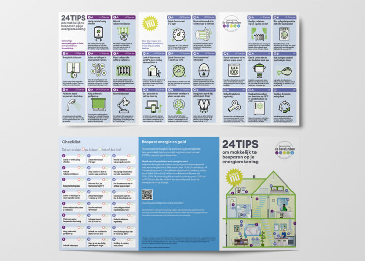 De 24 Energietips worden gedrukt op een A3 placemat, dubbelzijdig bedrukt. Maar je kunt deze ook als A5-folder bestellen. Je krijgt de tips in jouw huisstijl en met jouw logo erop. Ook kun je een eigen tekst aanleveren.